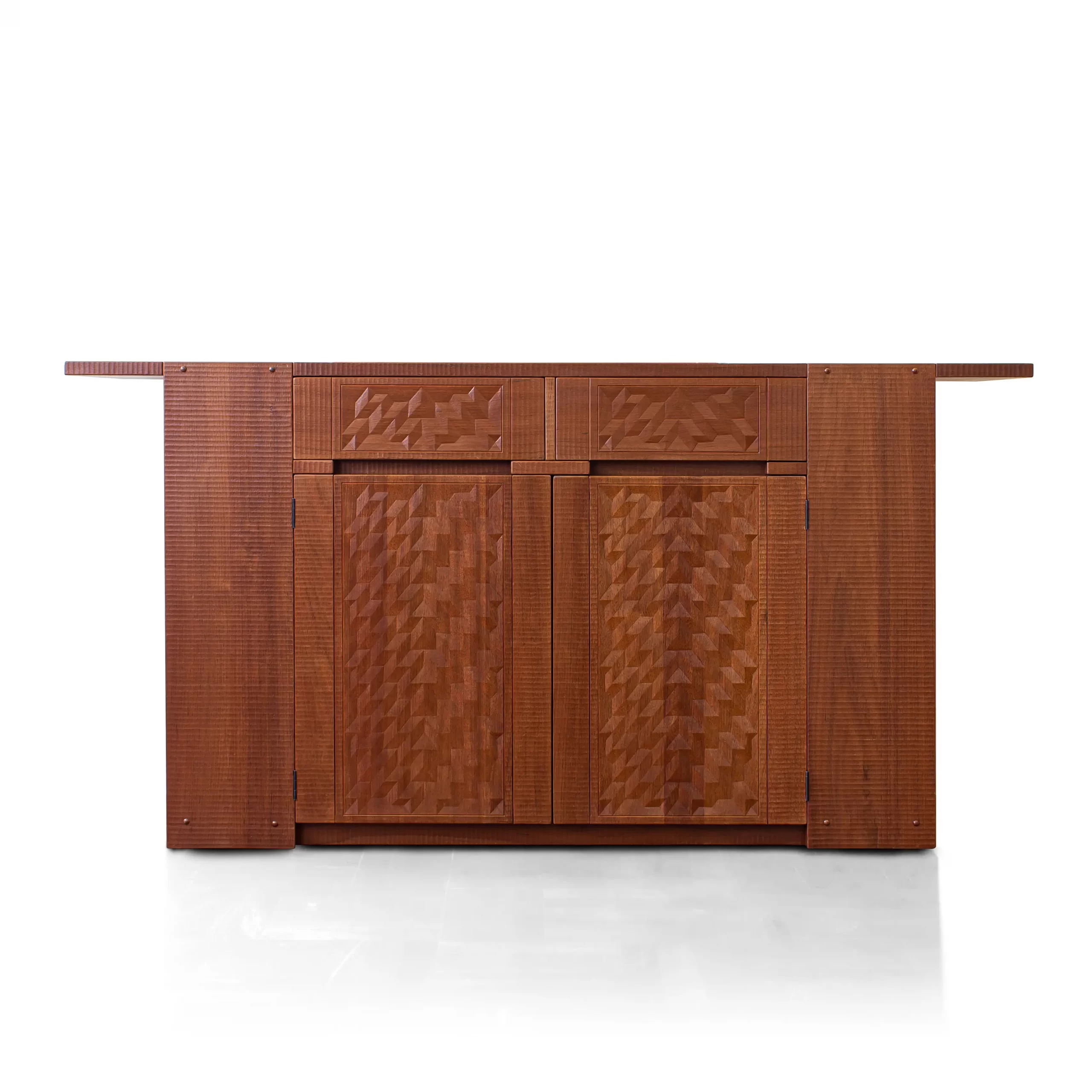 La firma de Artesanos Don Bosco: Escanaladuras talladas a mano en madera, creando un efecto ondulado único.