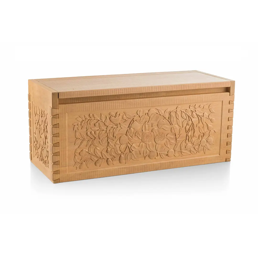 La firma de Artesanos Don Bosco: Escanaladuras talladas a mano en madera, creando un efecto ondulado único.