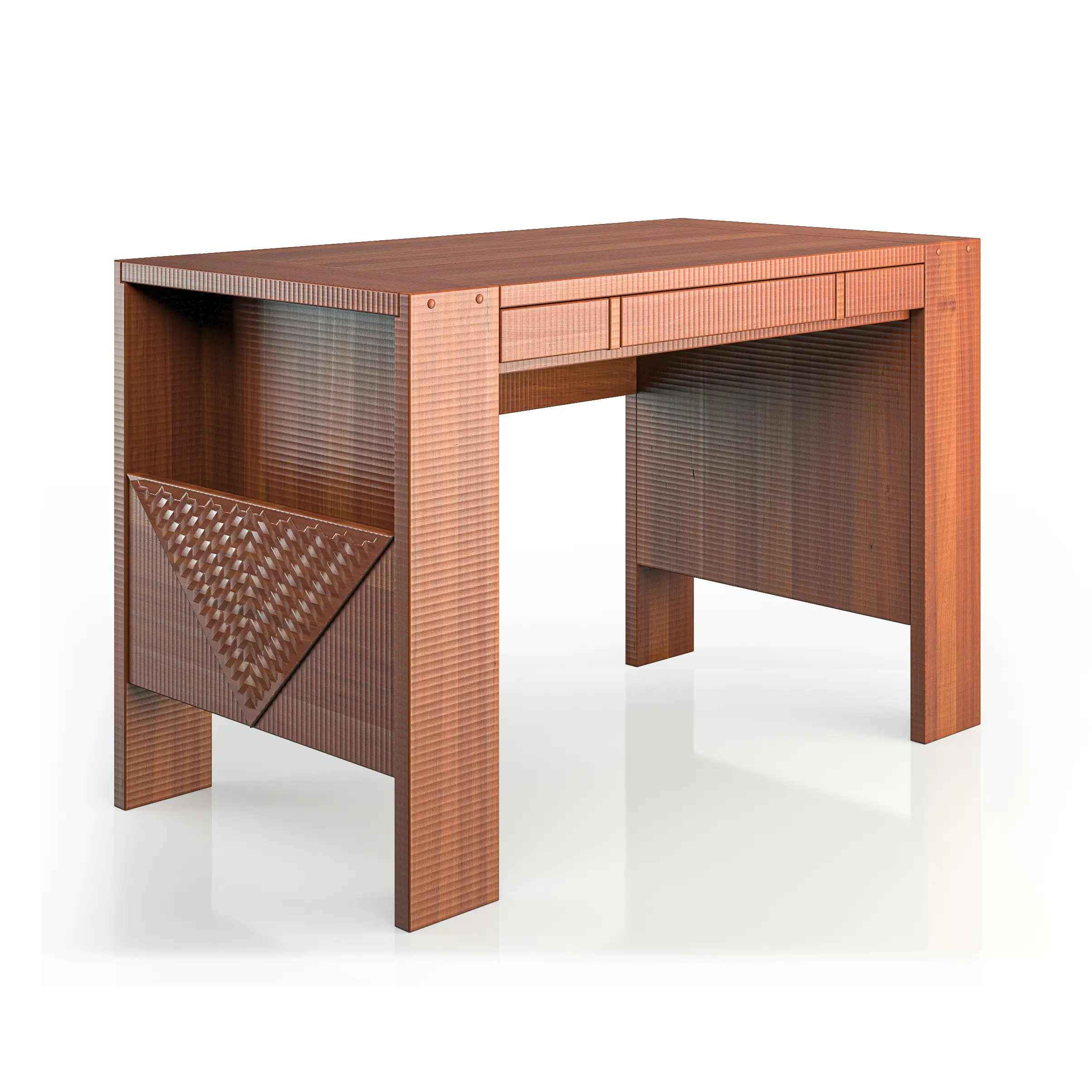 La firma de Artesanos Don Bosco: Escanaladuras talladas a mano en madera, creando un efecto ondulado único.