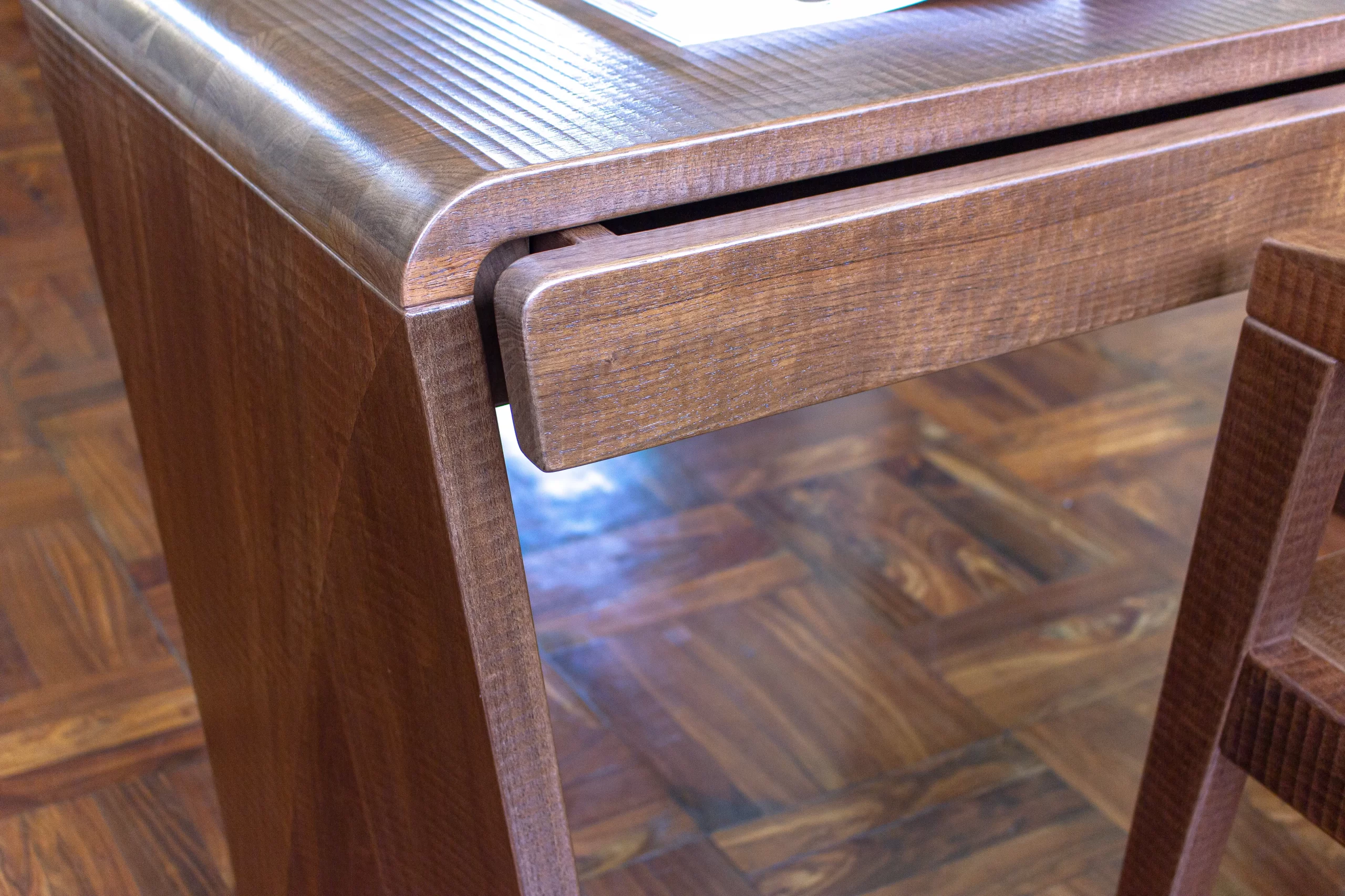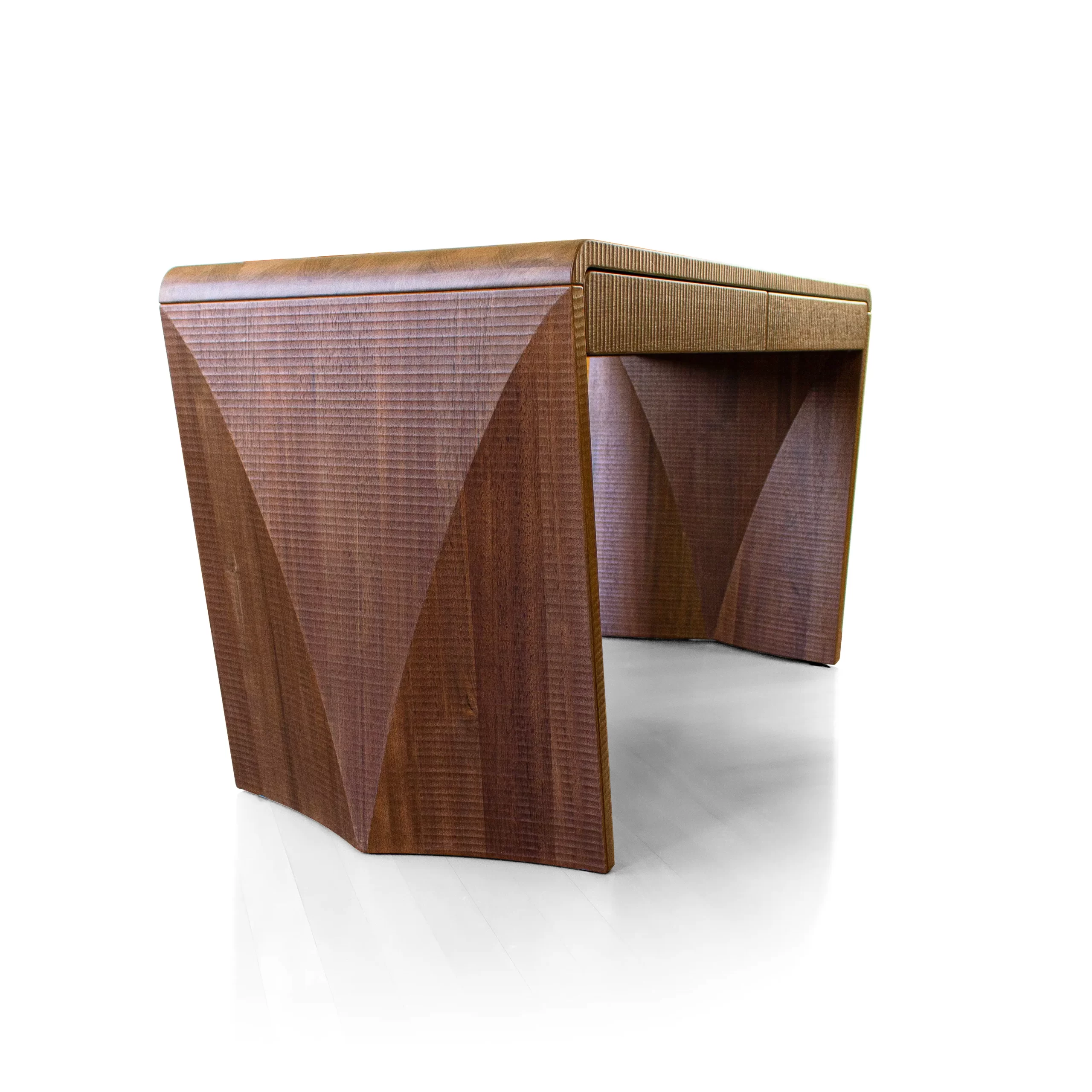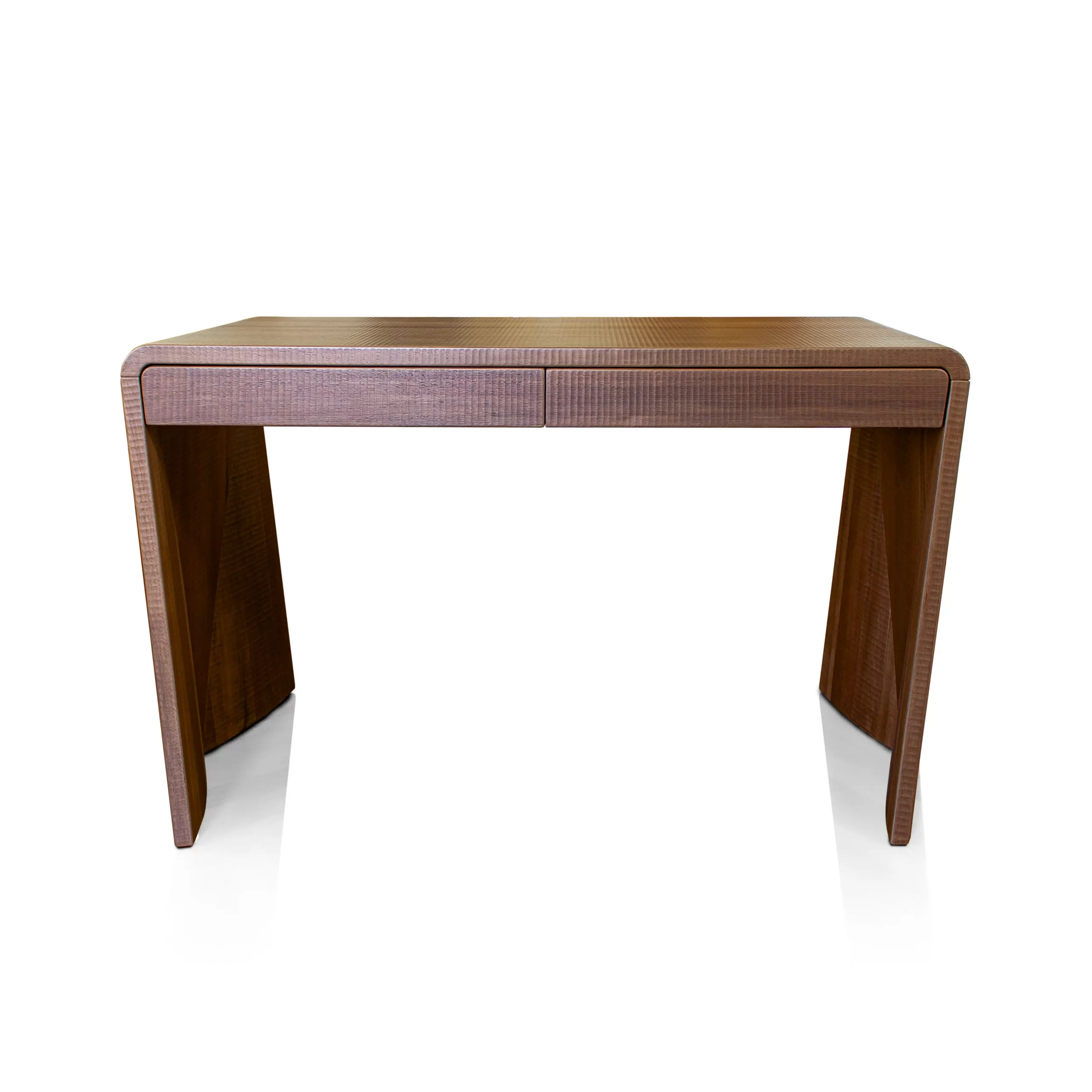 La firma de Artesanos Don Bosco: Escanaladuras talladas a mano en madera, creando un efecto ondulado único.