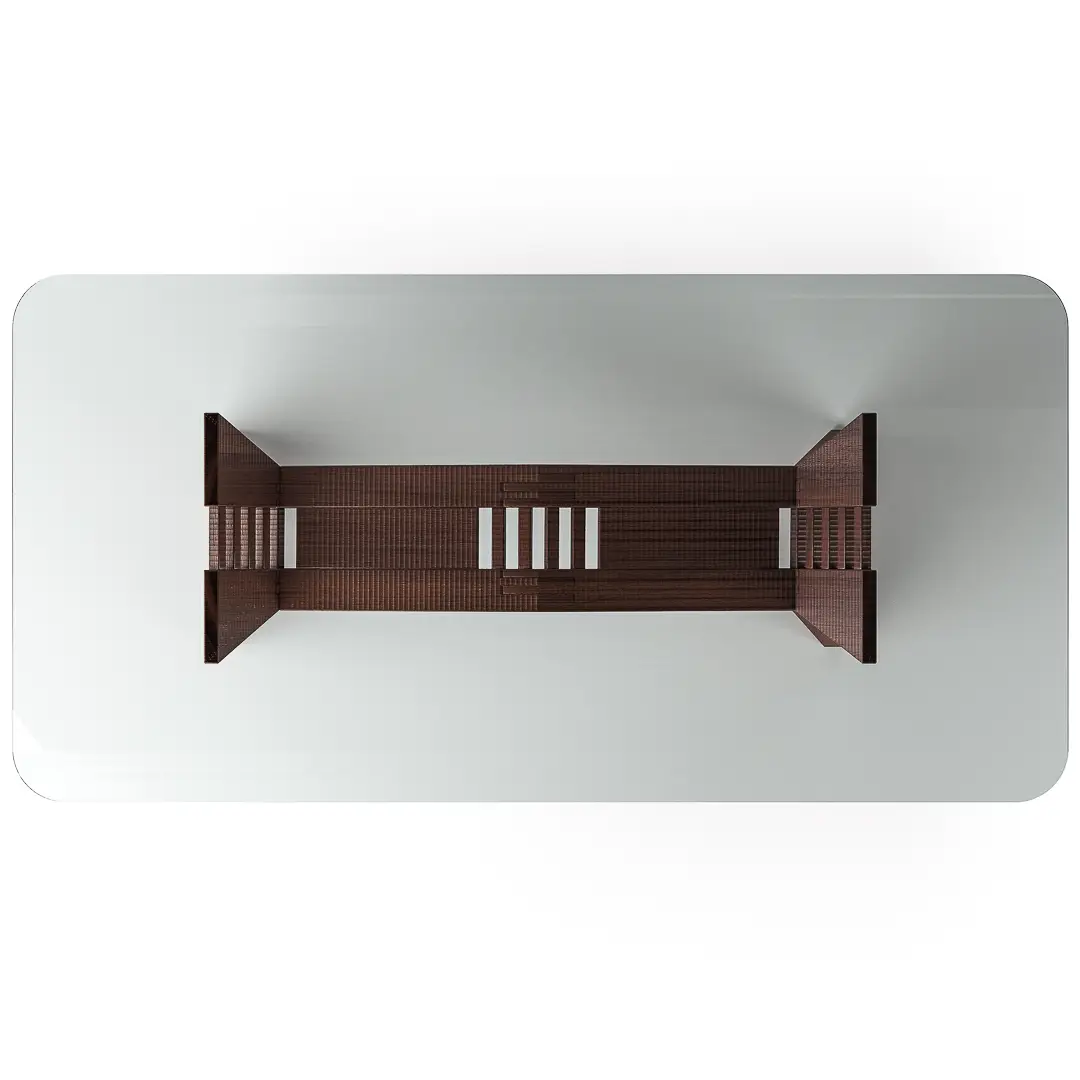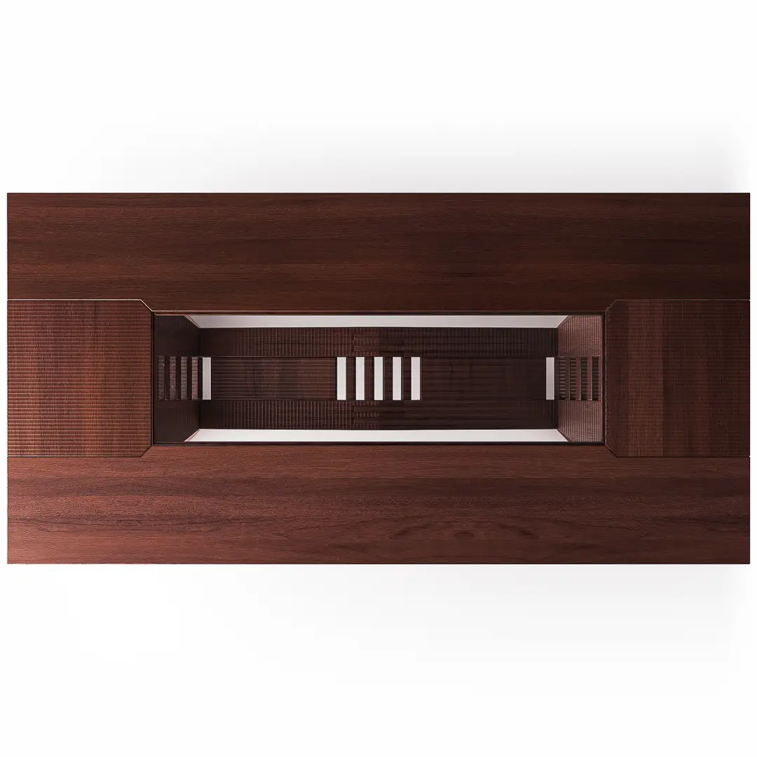 La firma de Artesanos Don Bosco: Escanaladuras talladas a mano en madera, creando un efecto ondulado único.