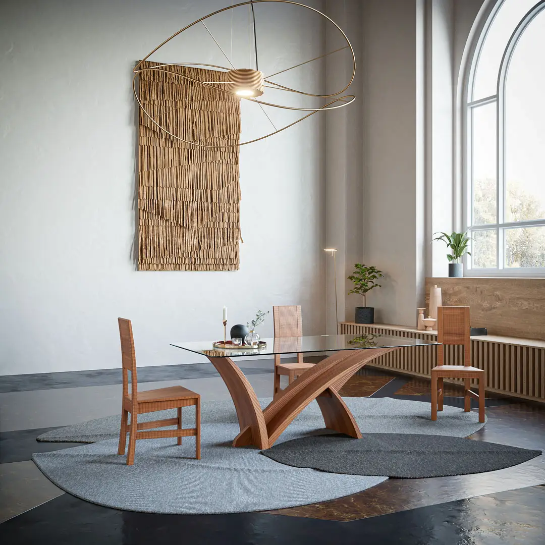 La firma de Artesanos Don Bosco: Escanaladuras talladas a mano en madera, creando un efecto ondulado único.