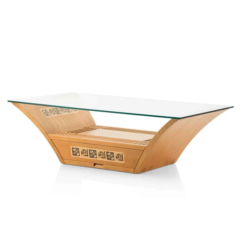 La firma de Artesanos Don Bosco: Escanaladuras talladas a mano en madera, creando un efecto ondulado único.