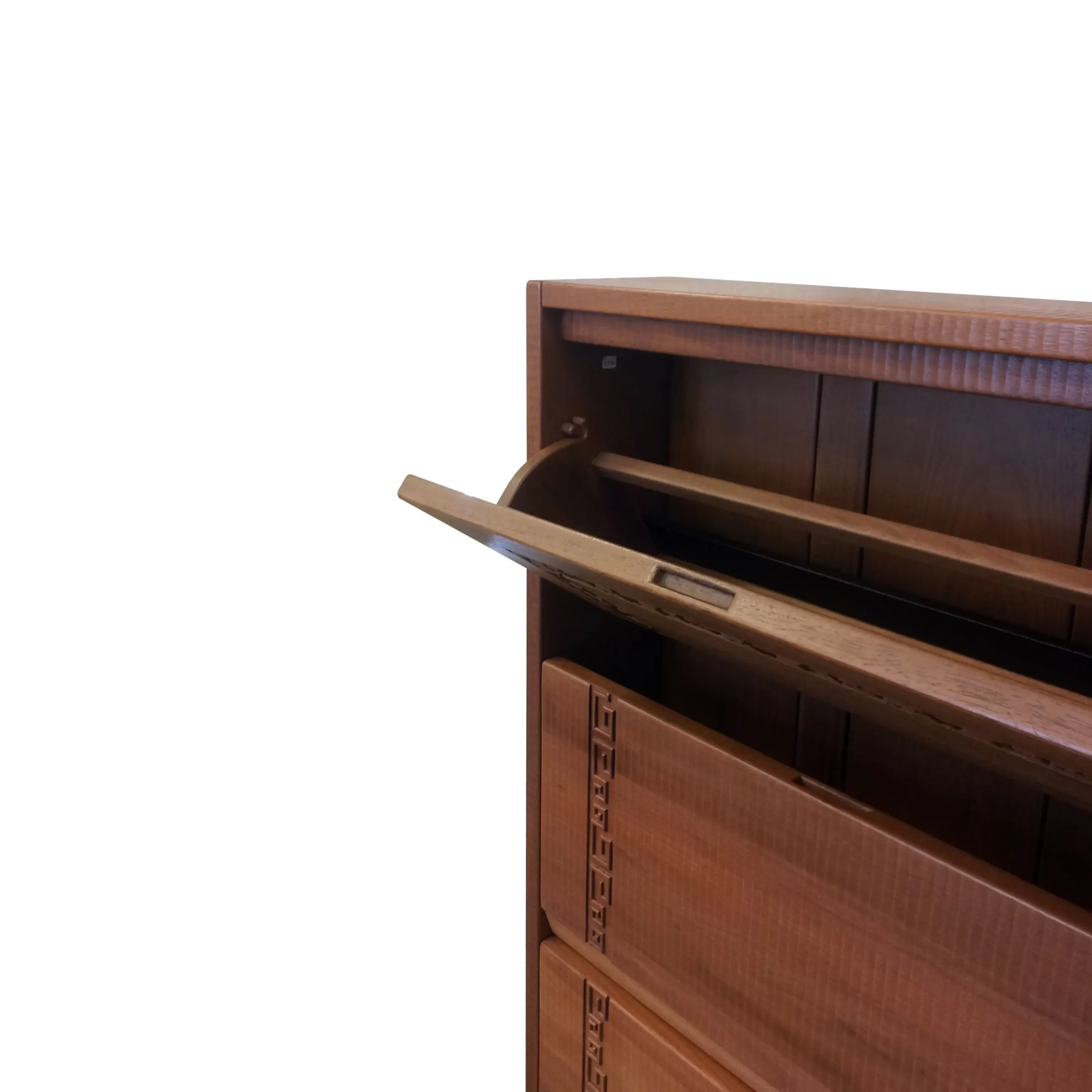 La firma de Artesanos Don Bosco: Escanaladuras talladas a mano en madera, creando un efecto ondulado único.