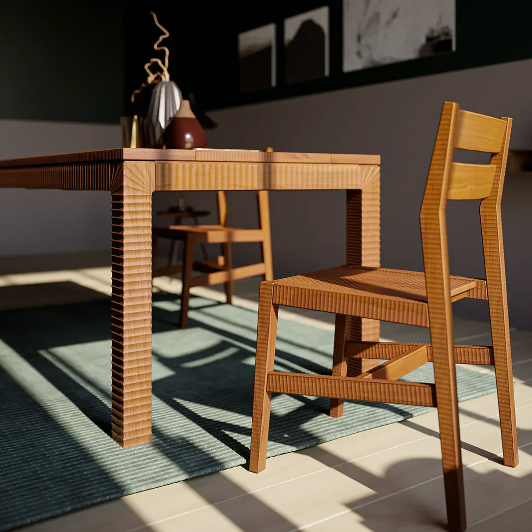 La firma de Artesanos Don Bosco: Escanaladuras talladas a mano en madera, creando un efecto ondulado único.