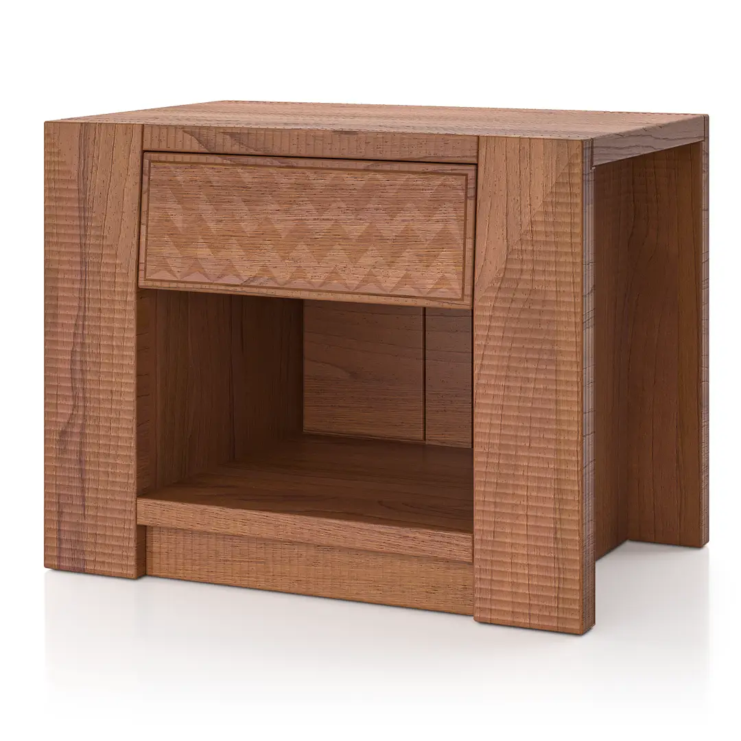 La firma de Artesanos Don Bosco: Escanaladuras talladas a mano en madera, creando un efecto ondulado único.